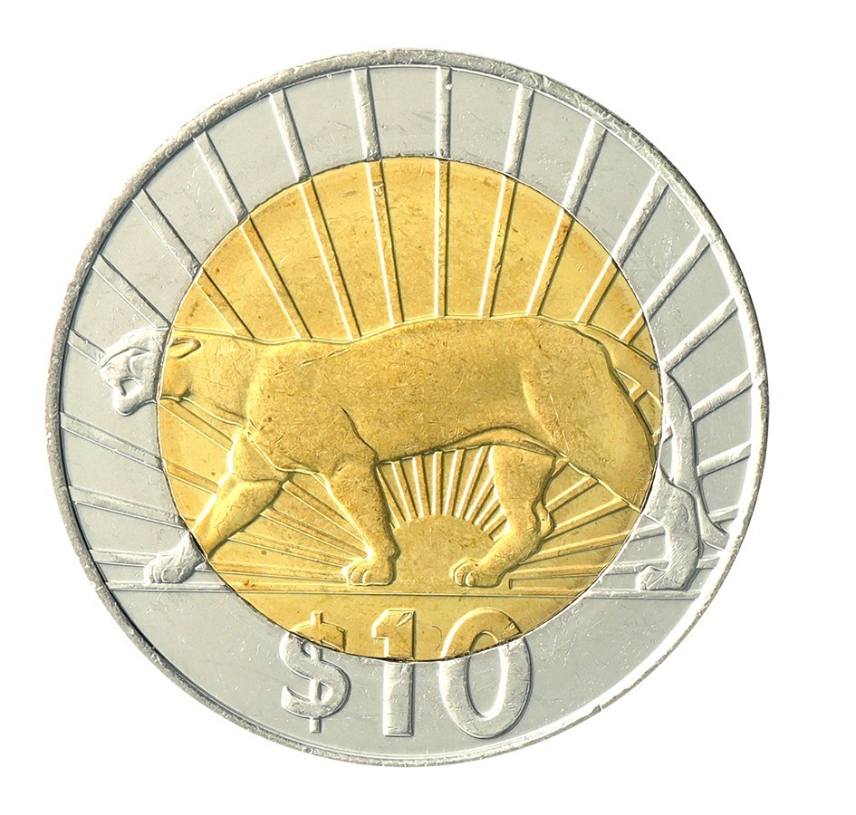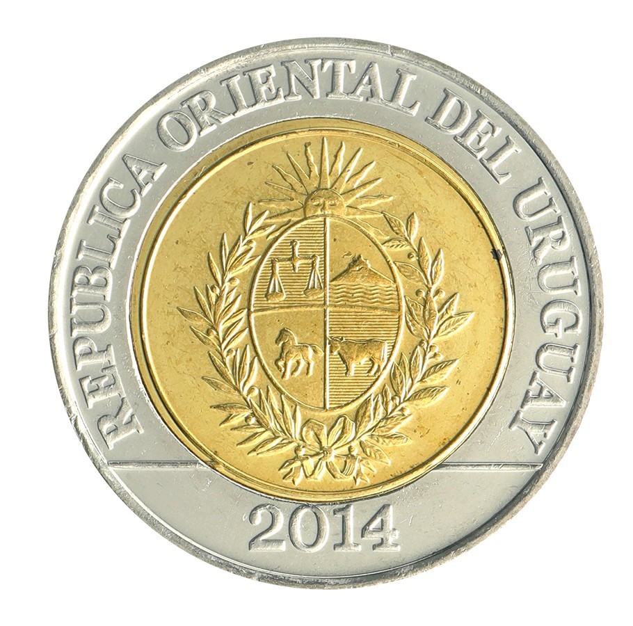 Description: This Uruguay 10 Pesos Uruguayos coin is a standard circulation coin issued in 2011-2015. It is a bimetallic coin that is in mint condition, weighs 10.5 g, and has a diameter of 28 mm. Its obverse side shows the coat of arms. Its reverse side features a cougar.