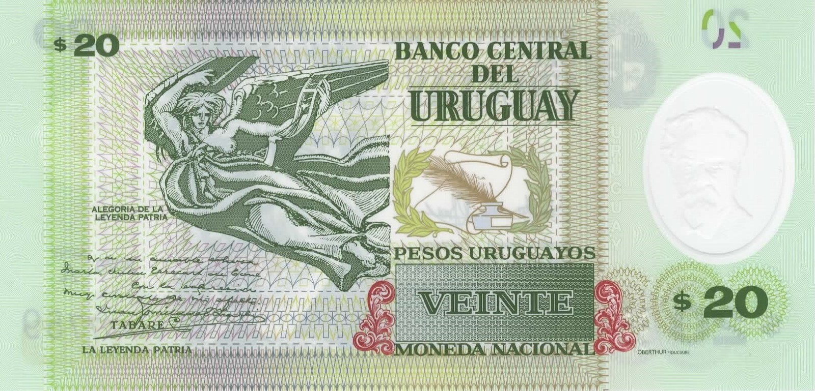 Description: One authentic uncirculated banknote with no bends, folds, pinholes, or tears. Bank of Uruguay.