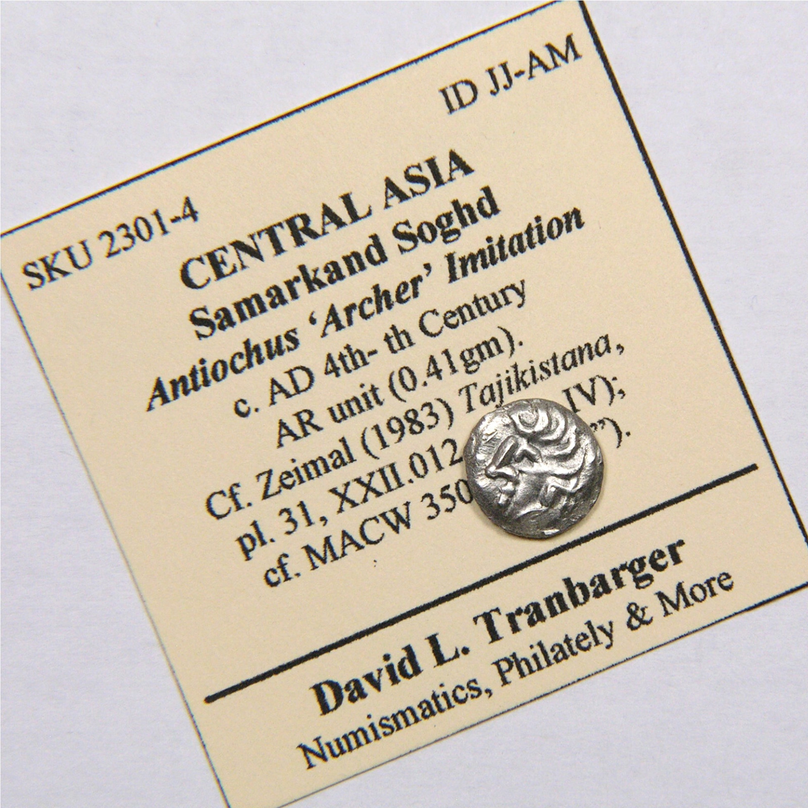 Description: The Sogdian “archer” coins are found in the region surrounding Samarkand in southeastern Uzbekistan. The prototype is the seated Apollo coinage of the Seleucid king Antiochus I (280-261 BC). Hoard evidence suggests that the circulation of the archer coins ended with the Hephthalite conquest of Sogdiana in AD 509, replaced by Sasanian and related coinage.
